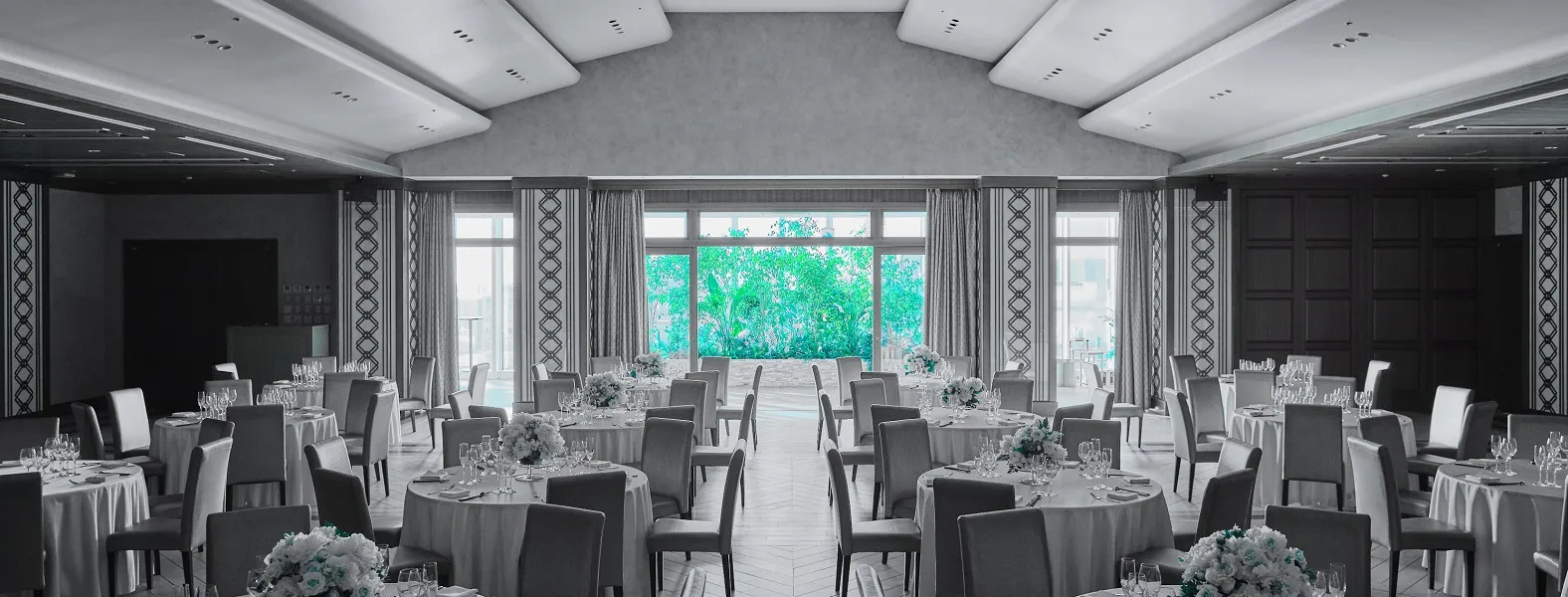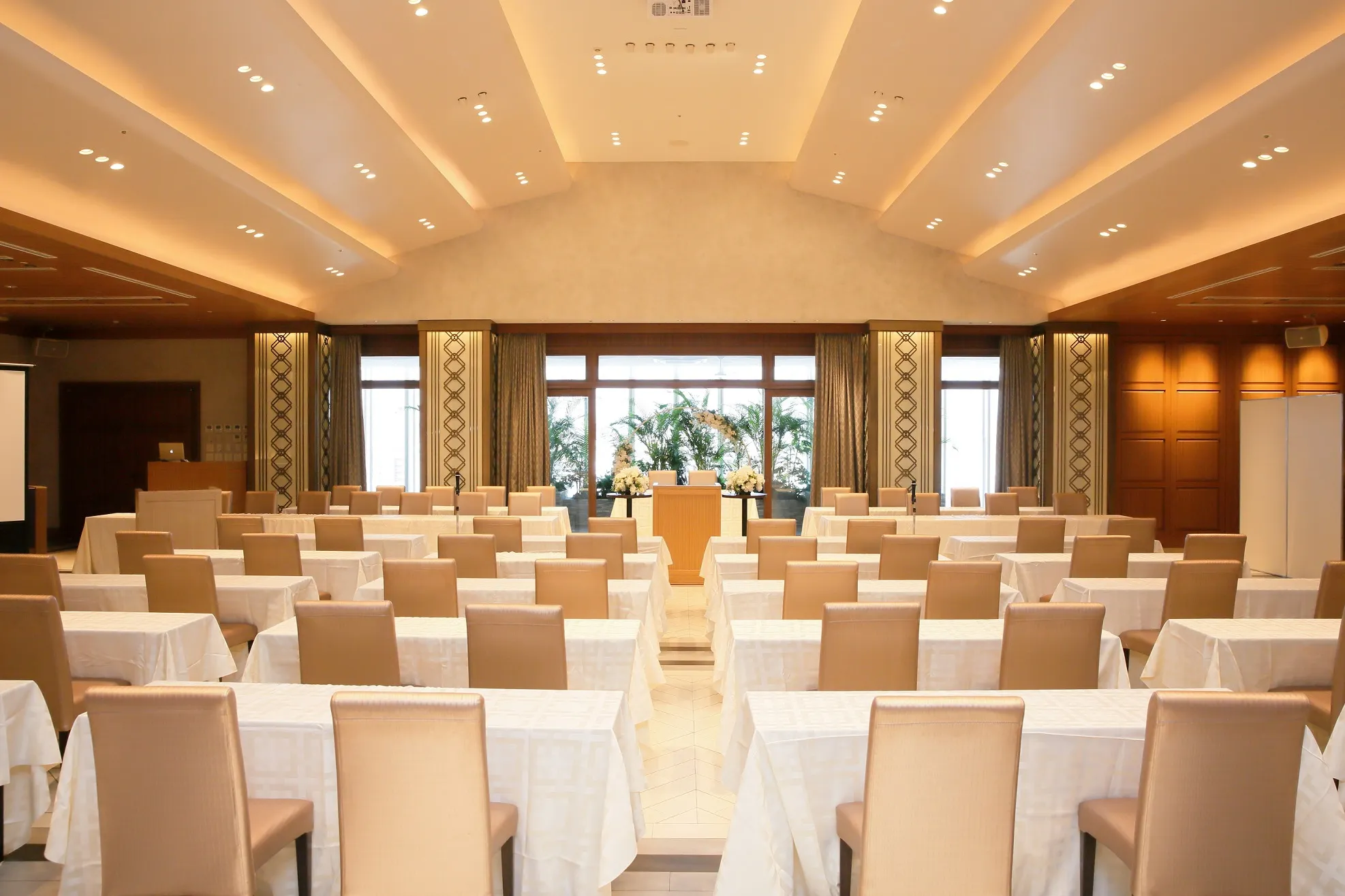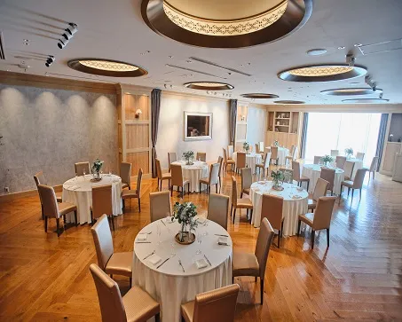 正餐(円卓):180名 / 立食ブッフェ:280名 / スクール:180名 / シアター:280名 / ロの字:60名 |