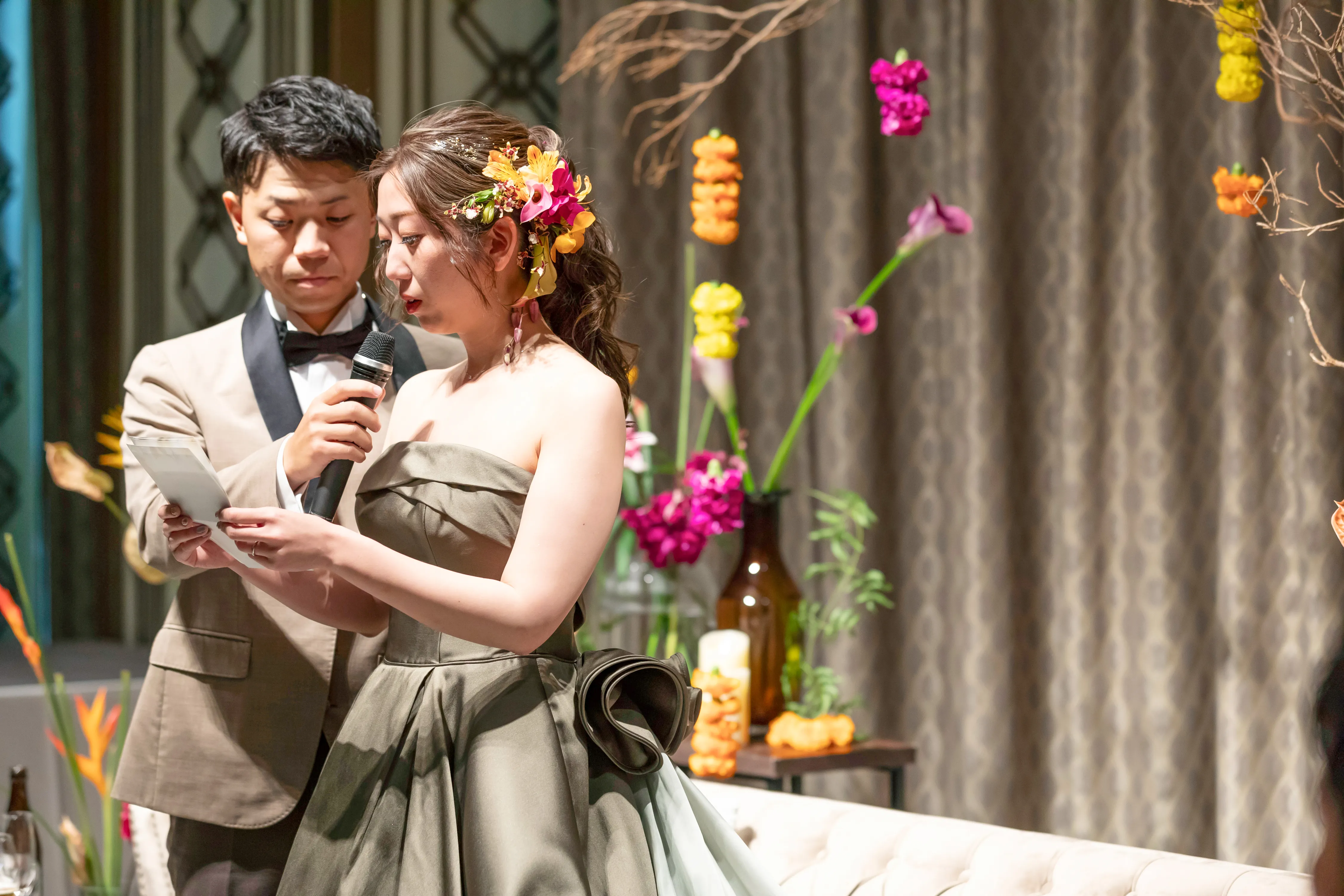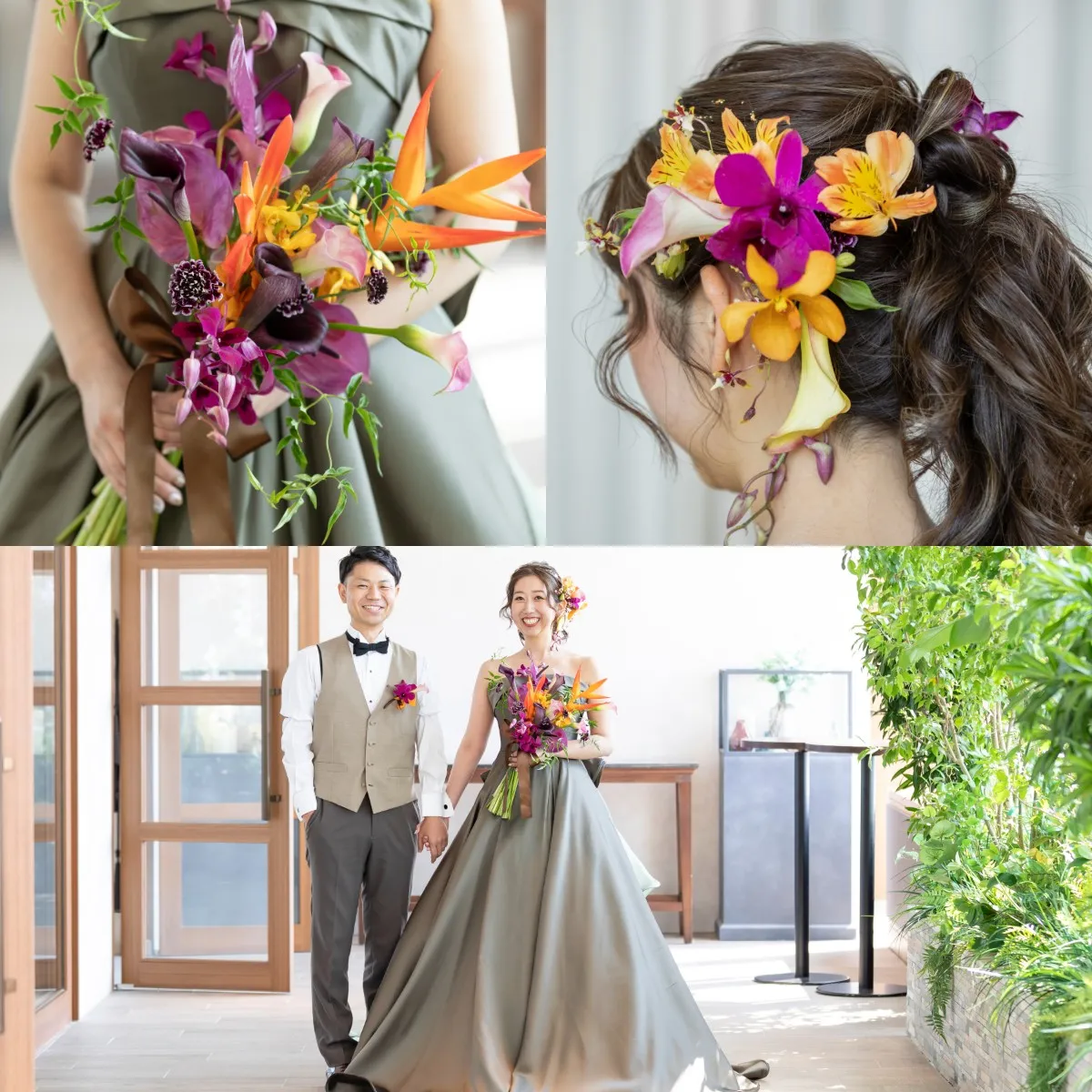 お色直しは会場合わせのブーケとヘッドパーツで大人っぽいシックなグリーンのドレスにチェンジ