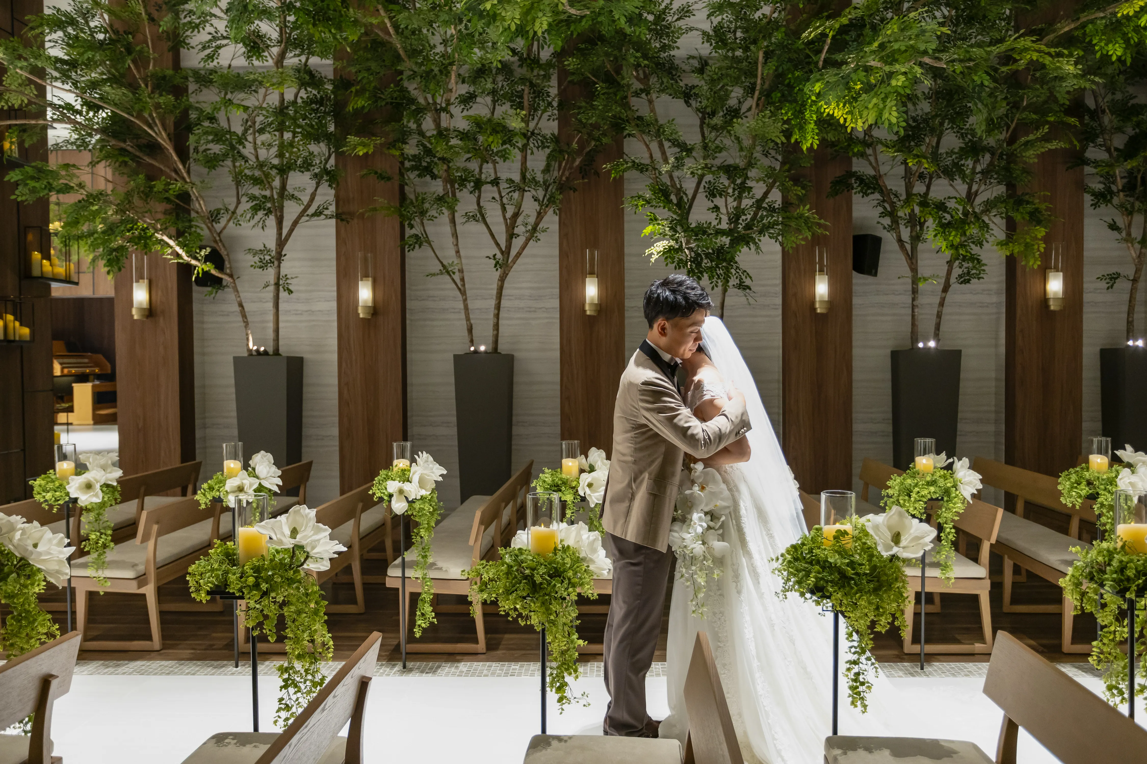 ゲストの皆様に見守られる中緑溢れるチャペルにて愛を誓われました